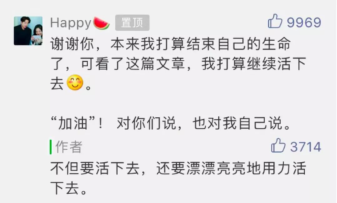 谢谢你,本来我打算结束自己的生命了,可看了这篇文章,我打算继续活下去 。